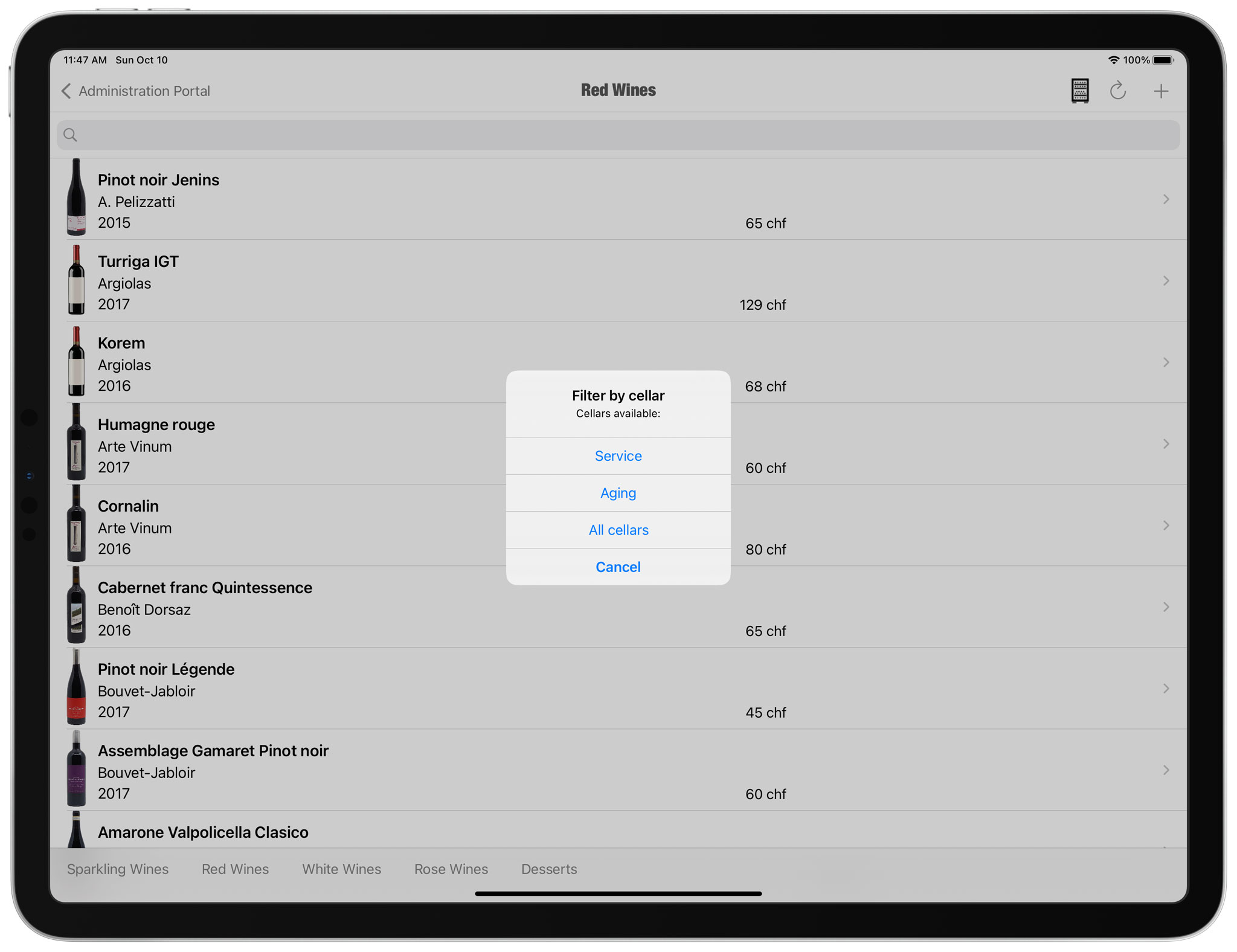 This button is visible in the “wine management” section on the top right. By pressing this button, the list of available cellars appears and you can filter the current list by cellar or display the wines of all the cellars.