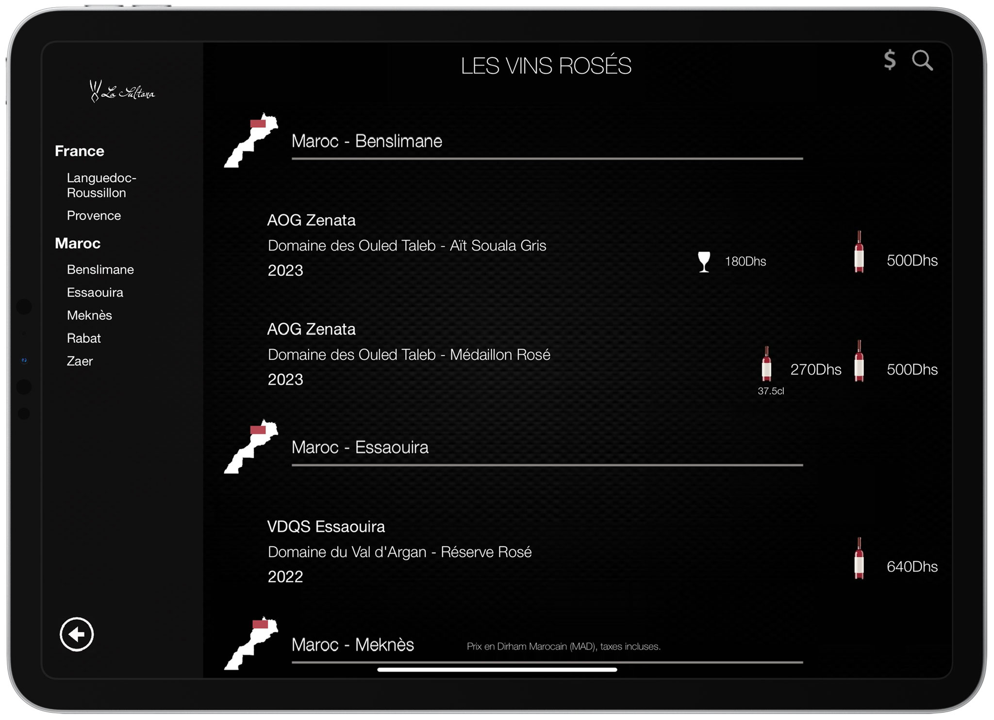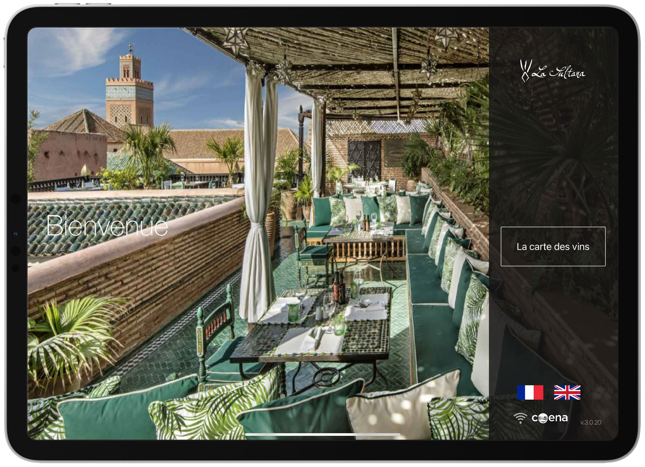 Les clients de La Sultana sont habitués au luxe et à l’attention aux détails, et la plateforme COENA améliore cette expérience en rendant le processus de choix des vins interactif et engageant. À table, les clients peuvent utiliser un iPad pour naviguer facilement dans la carte des vins. Finies les cartes statiques, les convives peuvent rechercher des vins spécifiques, filtrer les sélections par région ou explorer des informations détaillées sur des vins uniques du monde entier.